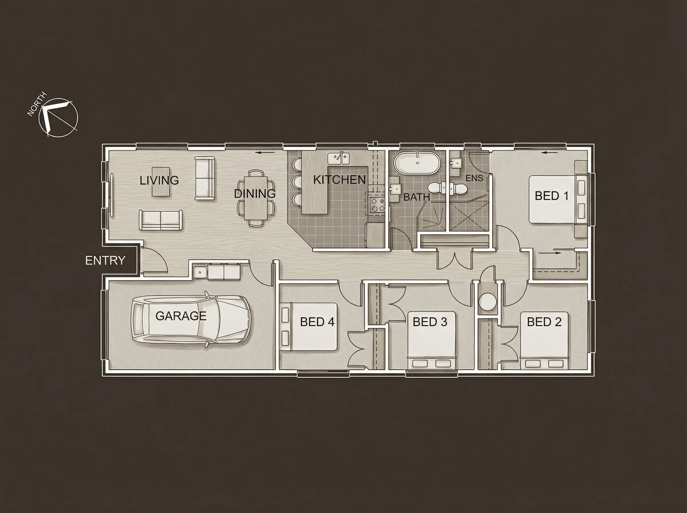 This home offers a warm and welcoming feel with its clean lines, soft textures, and thoughtful landscaping. The design brings in plenty of natural light through large windows that frame the living spaces beautifully. Set in a calm and friendly neighbourhood, the house sits among tidy gardens and quiet streets where everything feels cared for. It is the kind of place where evenings are peaceful, neighbours say hello, and life moves at a comfortable pace.