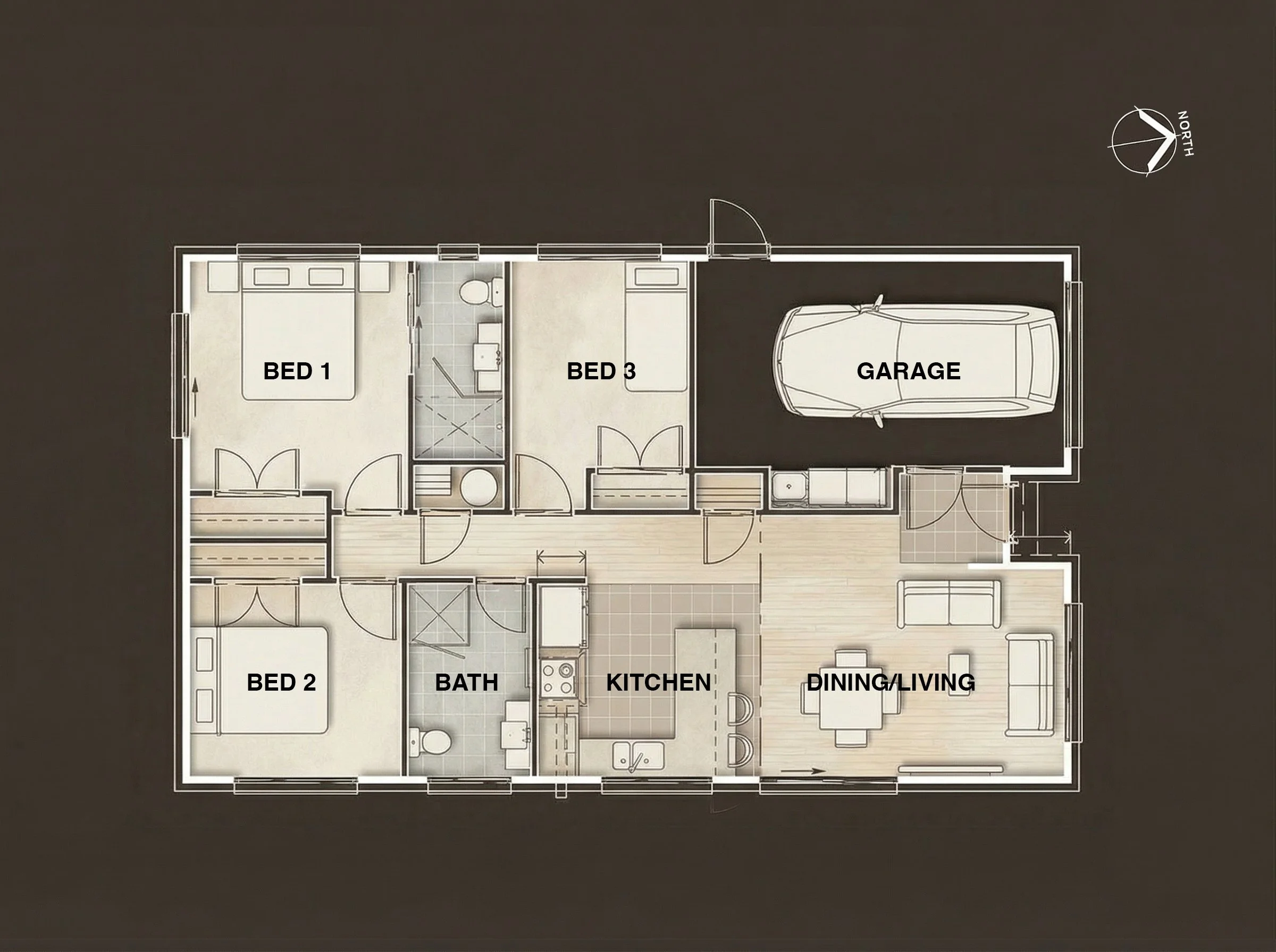 This home offers a warm and welcoming feel with its clean lines, soft textures, and thoughtful landscaping. The design brings in plenty of natural light through large windows that frame the living spaces beautifully. Set in a calm and friendly neighbourhood, the house sits among tidy gardens and quiet streets where everything feels cared for. It is the kind of place where evenings are peaceful, neighbours say hello, and life moves at a comfortable pace.